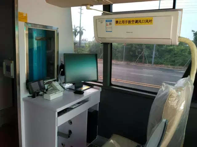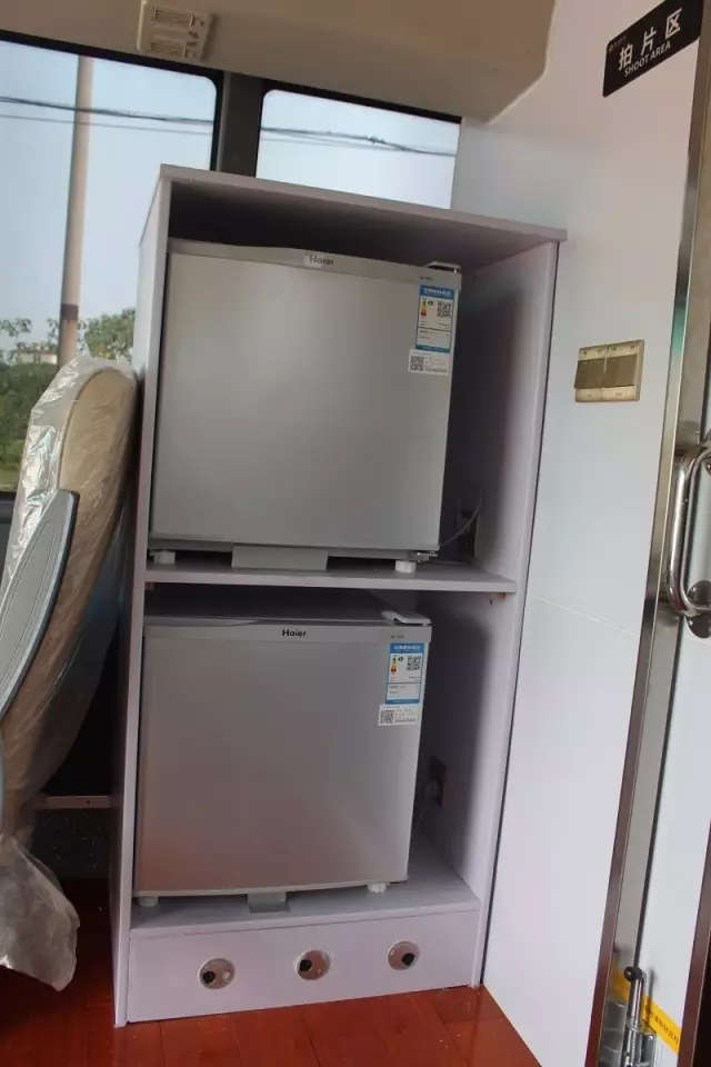 體檢車上配備4臺空調,2臺海爾小冰箱,一臺實木儲物柜