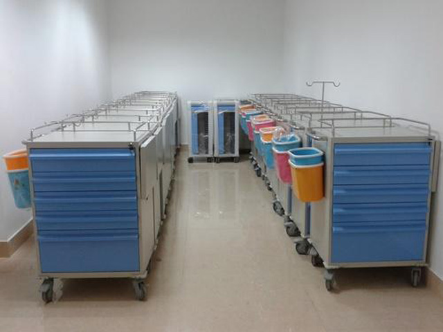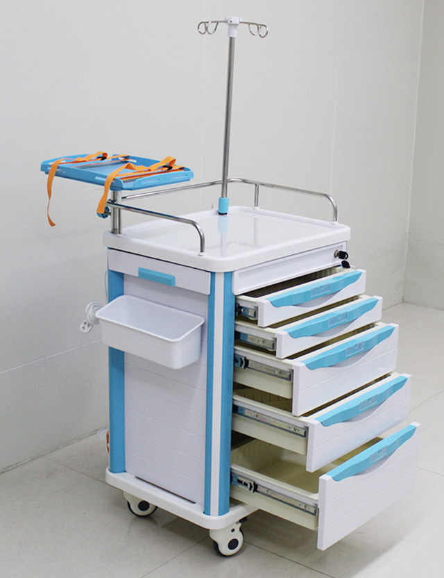 搶救車(chē)的基本構(gòu)造是車(chē)體、輪子、還有醫(yī)用櫥柜。櫥柜的柜體是放藥品的空格。車(chē)體有固定氧氣瓶的套筒。還配有輸液架,還有多個(gè)放物品的抽屜。蓋板可以蓋住藥物。采用了塑鋼材料,包含工作臺(tái)面,雜物箱,輸液架,輪子,垃圾桶。一般分四個(gè)層次,急救藥品區(qū),放置一定數(shù)量的急救藥品,根據(jù)藥品使用頻率來(lái)依次排列。輸液區(qū),放了輸液器、注冊(cè)器、留置針、止血貼、消毒棉、砂輪、等。呼吸物品區(qū),開(kāi)口器、壓舌板、吸氧管、各種型號(hào)插管喉鏡。其他物品,溫度計(jì)、血壓計(jì)、電筒、負(fù)壓吸引器等。