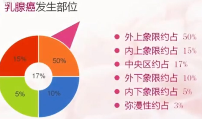 超聲影像最終的目的是要找出乳腺癌,做乳腺檢查的人絡(luò)繹不絕。那什么是乳腺癌呢?它有什么危害呢?乳腺癌是指發(fā)生于導(dǎo)管上皮,及末梢導(dǎo)管上皮的惡性腫瘤。乳腺癌的危害,一是致殘摧毀女性的自信。二是發(fā)病率及死亡率在所有惡性腫瘤中排名第一。對(duì)家庭的危害極大,婦女能頂半邊天,半邊天沒(méi)有了,這個(gè)家就相當(dāng)于塌了一半。乳腺癌的常見(jiàn)發(fā)生部位,外上象限約占50%,內(nèi)上象限約占15%,中央?yún)^(qū)約占17%,外下象限約占10%,內(nèi)下象限約占5%,彌漫性約占3%。乳腺癌術(shù)后5年生存率一期:80-90%,二期:60-70%,三期:40%。因此 提高乳腺癌生存率和降低死亡率的關(guān)鍵在于早發(fā)現(xiàn)早診斷早治療。