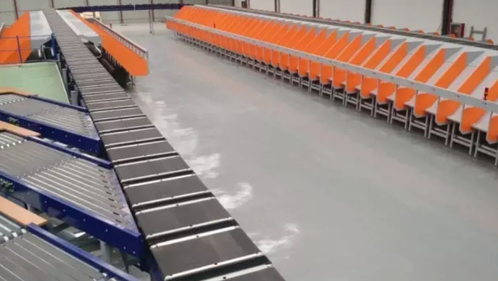 交叉帶分揀機(jī),交叉帶分揀機(jī)有很多種型式,比較普遍的為一車雙帶式,即一個(gè)小車上面有兩段垂直的皮帶,既可以每段皮帶上搬送一個(gè)包裹也可以兩段皮帶合起來搬送一個(gè)包裹。在兩段皮帶合起來搬送一個(gè)包裹的情況下,可以通過在分揀機(jī)兩段皮帶方向的預(yù)動(dòng)作,使包裹的方向與分揀方向相一直以減少格口的間距要求。優(yōu)點(diǎn):噪音低、可分揀貨物的范圍廣,通過雙邊供包及格口優(yōu)化可以實(shí)現(xiàn)單臺(tái)最大能力約2萬件每小時(shí)。缺點(diǎn):造價(jià)比較昂貴、維護(hù)費(fèi)用高。