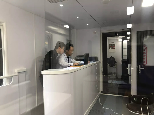 體檢車上都有這些檢查室?車廂里有男女彩超室,男女心電圖室,內(nèi)科、外科以及,骨密度、碳十三檢測室等,可以對血常規(guī)、肝膽功能,腎功能、空腹血糖、尿常規(guī),心電圖、肝膽胰脾B超等項目進(jìn)行檢查。車上都有這些功能室?候診登記處可以在候診區(qū)等待就診,各類醫(yī)療用品和采樣冷藏柜也很完善。體檢車廂配置了全自動生化分析儀、全自動尿液分析儀、B超檢查室、心電圖檢查室等,可以進(jìn)行前臺導(dǎo)診、采血、尿液檢查、實驗室化驗、DR拍攝、超聲心電檢查等項目,能夠為職工進(jìn)行全面體檢,最快當(dāng)天即可出結(jié)果。