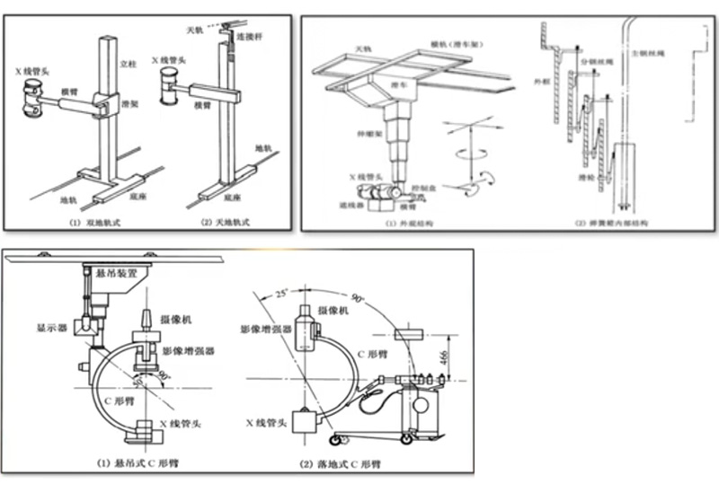 落地式:分為雙地軌式X線管組件支持裝置、天地軌式X線管組件支持裝置和攝影床一體化式X線管組件支持裝置。雙地軌式X線管組件支持裝置:立柱由兩條地軌支持,立柱固定在底座上,底座在雙地軌上滑動,帶動立柱和X線管組件在雙軌道上縱向水平移動。這種立柱支持方式對機房高度無特殊要求,安裝方便,缺點是地面軌道較多,顯得不整潔。天地軌式X線管組件支持裝置:立柱由一條地軌和一條天軌支持,其主體由立柱和連接桿組成。連接桿可上下伸縮,以在一定范圍內(nèi)適應(yīng)不同高度的房間。天軌不承重,只起支持作用,安裝不太復(fù)雜,應(yīng)用較多。這種結(jié)構(gòu)形式地面上只有一條軌道,較為整潔。懸吊式X線管組件支持裝置與前面落地式X線管組件支持裝置相比,結(jié)構(gòu)復(fù)雜、安裝難度較大、相對成本較高,但它能充分利用機房上部,具有運動靈活、操作方便、運用范圍廣的特點,所以特別適用于多功能X線攝影。懸吊式X線管組件支持裝置由固定縱向天軌、移動橫軌、滑車、伸縮架、橫臂、控制盒和X線管組件等組成。為適應(yīng)各種不同X線特殊檢查而設(shè)計的,名稱因其形狀而來。C形臂的一端裝X線管頭和遮線器,另一端裝攝影轉(zhuǎn)換和記錄裝置如影像增強器、電視攝像機、點片照相機和電影攝像機等。C形臂式可以和懸吊臂式的裝置結(jié)合,組成懸吊式C形臂支持裝置可以與專用底座結(jié)合成落地式C形臂支持裝置。