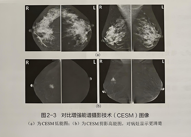 CESM是在“乳腺鉬靶”基礎(chǔ)上衍生的一項(xiàng)新技術(shù)。CESM是通過(guò)靜脈注射對(duì)比劑后進(jìn)行高能量和低能量曝光,觀察病灶是否增強(qiáng)(黑白圖像中“變亮”的影像),經(jīng)過(guò)后處理獲得低能圖和減影圖,可在一定程度 上反映乳腺病灶攝取碘對(duì)比劑的能力,間接反映其血供情況,而且減影圖像可去除周圍正常重疊腺體,使病灶清晰顯示。CESM生成兩套“鉬靶圖像”一套低能圖,與常規(guī)鑰靶圖像類似:另-套剪影圖,為剔除乳腺正常腺體組織背景直接顯示強(qiáng)化“變亮“的病灶圖像。CESM能夠做到“去偽存真”,顯著降低假陽(yáng)性率和假陰性率,也大大提高影像醫(yī)師的工作效率和診斷能力(圖2-3)。