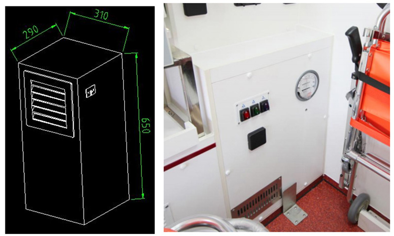 車載負壓凈化裝置適用于安裝在負壓救護車醫(yī)療艙內,以實現(xiàn)醫(yī)療艙負壓隔離要求。負壓救護車醫(yī)療艙內受生物污染的空氣經車載負壓凈化器高效過濾后排出車外,保證不污染外部環(huán)境。采用本裝置后,根據(jù)車體密封程度的不同,可達到-10Pa~-80Pa的負壓。在正常情況下,負壓救護車醫(yī)療艙內負壓達到-10Pa~-80Pa即可滿足技術要求。