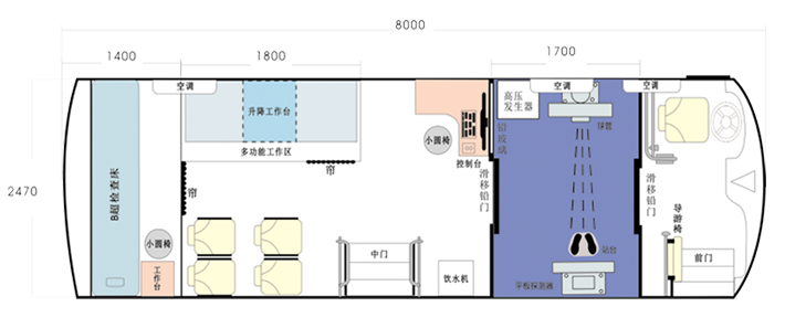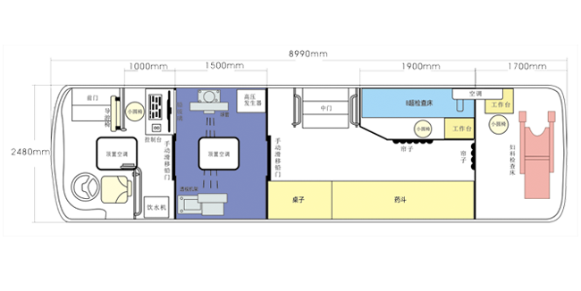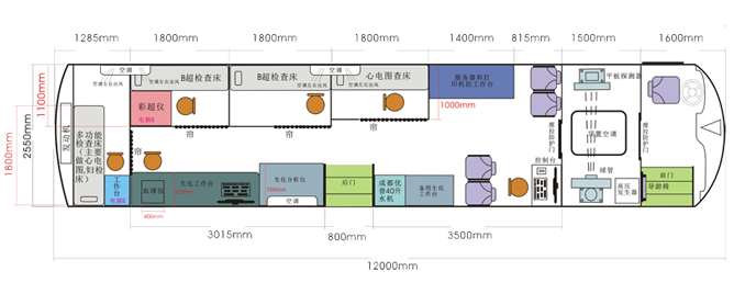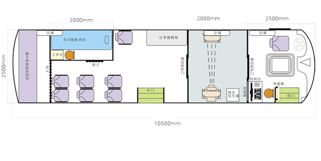 車載DR體檢車功能卻很齊全,車上配裝X光機、心電超聲檢查、電測聽室、全自動生化分析儀以及檢查床、冰柜、空調(diào)和紫外線消毒燈等先進醫(yī)療儀器設備。